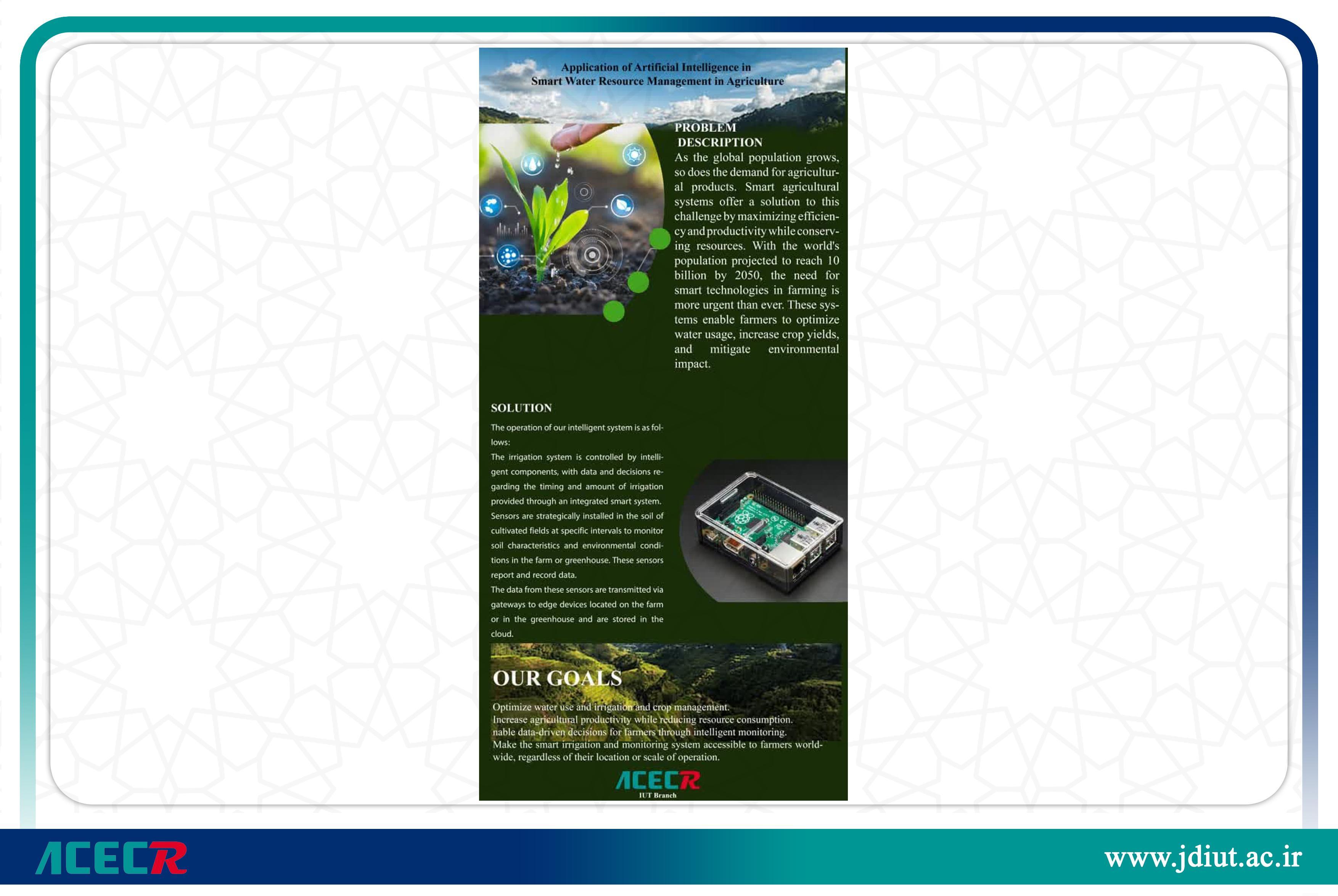 در این طرح پژوهشگران واحد صنعتی اصفهان با استفاده از هوش مصنوعی و یادگیری ماشینی و همچنین بردهای اینترنت اشیاء، سامانهای طراحی و پیادهسازی کردهاند که ضمن در نظر گرفتن عوامل محیطی منابع محدود آب را در بهترین کارایی خود به کار گرفته و ضمن جلوگیری از هدر رفت آب، میتواند بهبود کیفیت محصول را به دنبال داشته باشد. این سامانه که پلتفرم کاملی شامل سختافزار و نرمافزار است میتواند بسیاری نیازهای دیگر از جمله کنترل رشد گیاه، بیماریهای احتمالی و ... را در فرایند کشاورزی برآورده نماید.