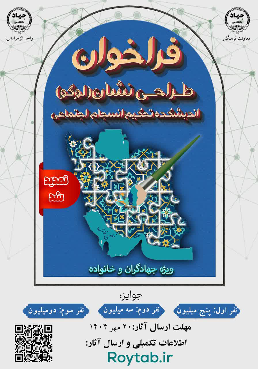 به گزارش روابط عمومی جهاددانشگاهی واحد الزهرا(س)، فراخوان طراحی لوگوی اندیشکده تحکیم انسجام اجتماعی، ویژه جهادگران و خانوادههای آنان تمدید شد.
