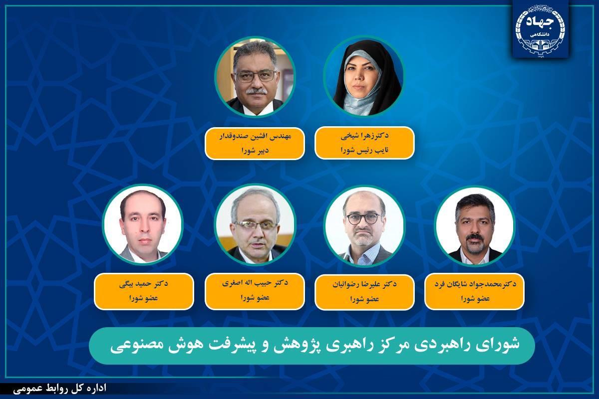 در این احکام دکتر زهرا شیخی معاون پژوهش و فناوری به عنوان نایب رئیس شورا، مهندس افشین صندوقدار رییس مرکز راهبری پژوهش و پیشرفت هوش مصنوعی به عنوان دبیر شورا، دکتر محمدجواد شایگان فرد دانشیار گروه کامپیوتر دانشگاه علم و فرهنگ جهاددانشگاهی، دکتر علیرضا رضوانیان دانشیار گروه کامپیوتر دانشگاه علم و فرهنگ جهاددانشگاهی، دکتر حبیباله اصغری استادیار سازمان جهاددانشگاهی خواجه نصیرالدین طوسی و دکتر حمید بیگی عضو هیأت علمی دانشگاه صنعتی شریف به عنوان اعضای این شورا منصوب شدند.