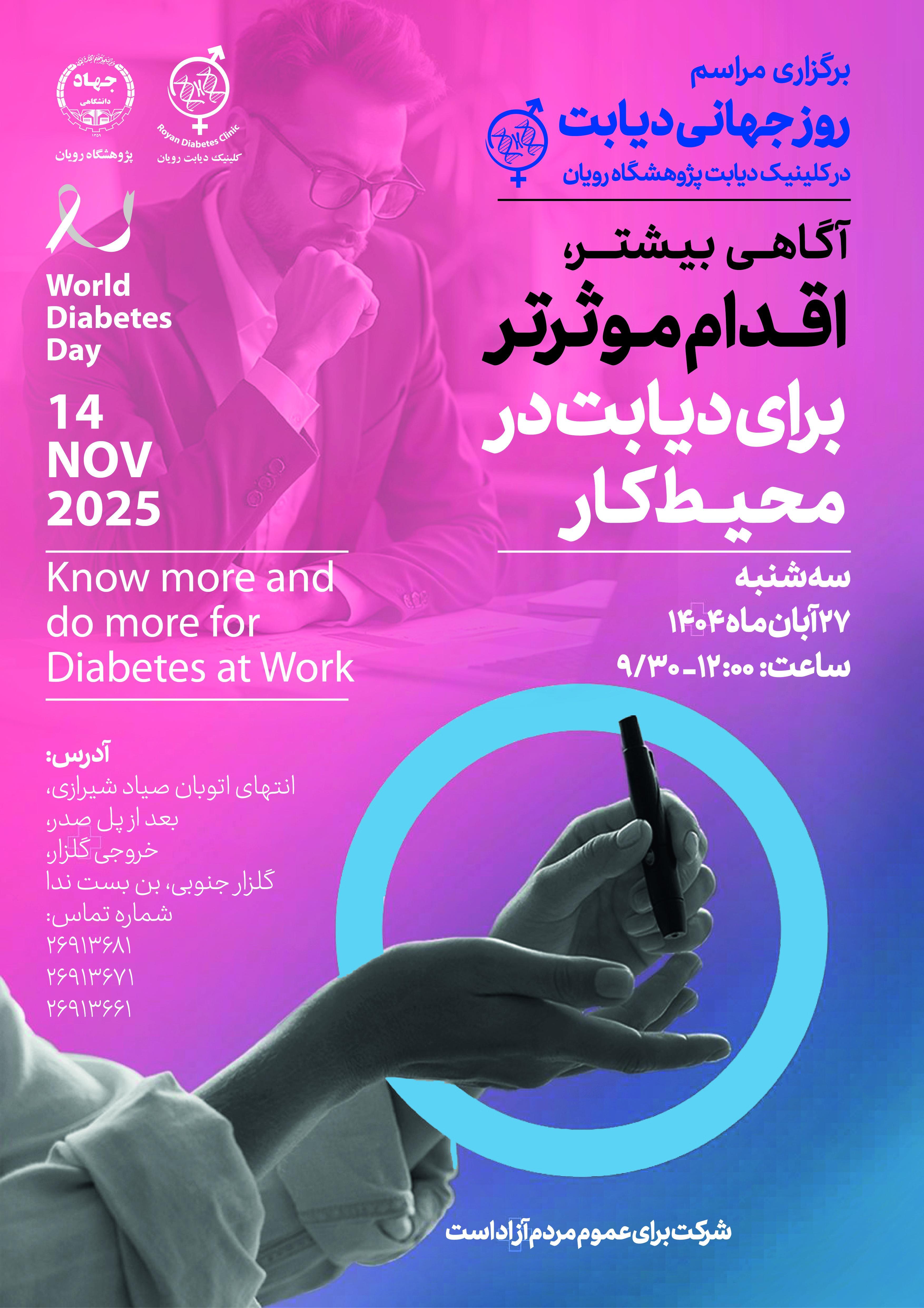به گزارش روابط عمومی پژوهشگاه رویان جهاددانشگاهی، کلینیک دیابت، چاقی و متابولیسم پژوهشگاه رویان جهاددانشگاهی، با هدف پیشگیری، کنترل و مدیریت بیماری دیابت، همایش مردمی روز جهانی دیابت را برگزار میکند. این رویداد با شعار جهانی سال ۲۰۲۵ «آگاهی بیشتر، اقدام مؤثرتر، برای دیابت در محیط کار» روز سهشنبه ۲۷ آبانماه ۱۴۰۴ از ساعت ۹:۳۰ تا ۱۲:۰۰ در محدودۀ منطقه یک شهرداری تهران در کلینیک دیابت پژوهشگاه رویان برگزارمی شود.