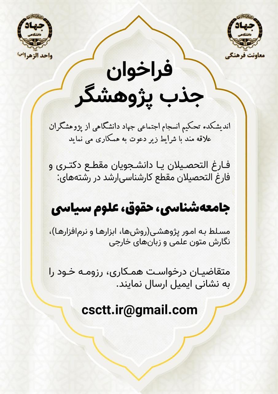 فراخوان جذب پژوهشگر در اندیشکده تحکیم انسجام اجتماعی جهاددانشگاهی